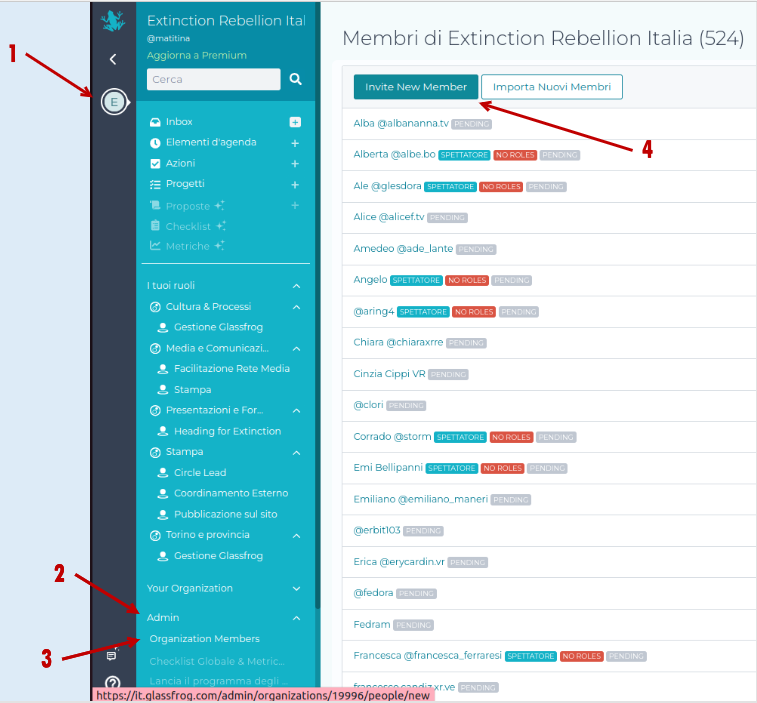Cliccare in alto a sinistra la scritta “Extinction Rebellion”: si aprirà una barra dove trovo “Membri dell’Account”