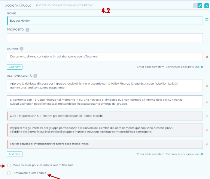 Selezionando la casella “fai di questo ruolo un cerchio”, verrà creato sottocerchio in cui poi si potrà definire coordinatori interni e esterni e aggiungere i membri che ne fanno parte. Non selezionandola invece rimarrà un semplice ruolo all’interno del cerchio e potrà essere occupato da una o più persone.