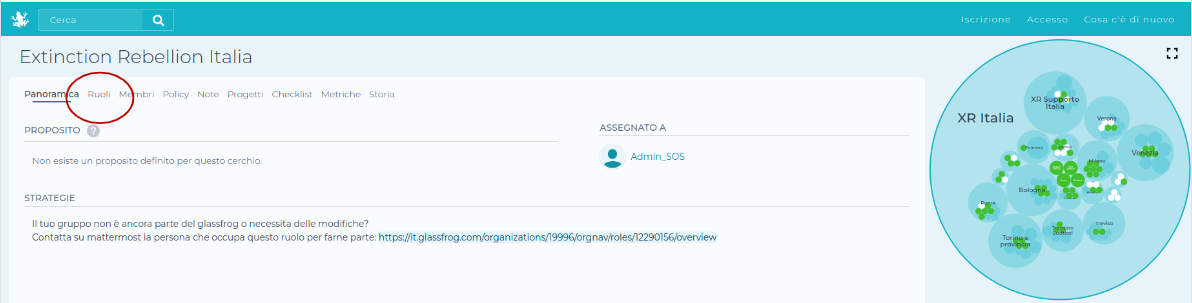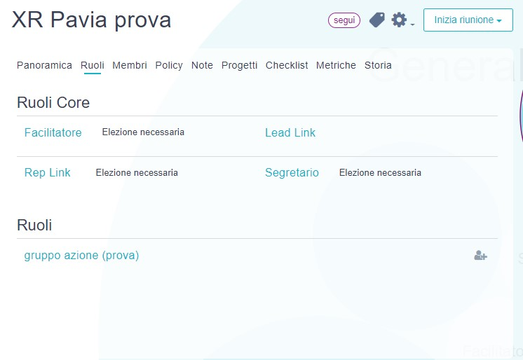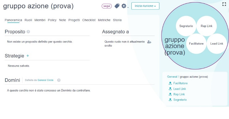 Da questa schermata per esempio, dove ho a destra il cerchio del gruppo azione, potrò creare e modificare ruoli all’interno del cerchio azione.