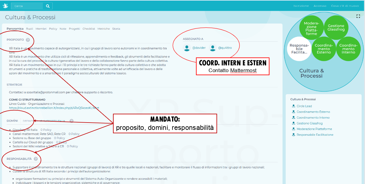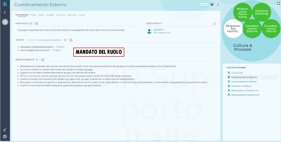 Questa è la schermata da cui si possono creare ruoli e sottocerchi con i propri mandati e domini, oltre che eleggere i coordinatori esterni e interni e modificare i sottocerchi.