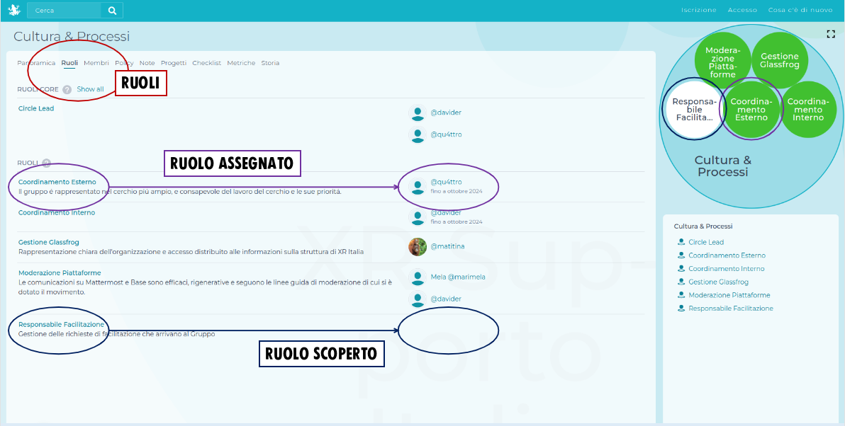 Per vedere tutti i ruoli all’interno di un cerchio è sufficiente cliccare “ruoli”