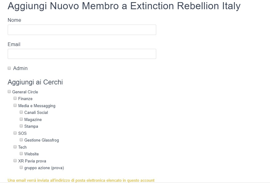 Per aggiungere un membro bisogna aggiungere nome, email. Si può poi aggiungere come membro ai cerchi di cui fa parte.